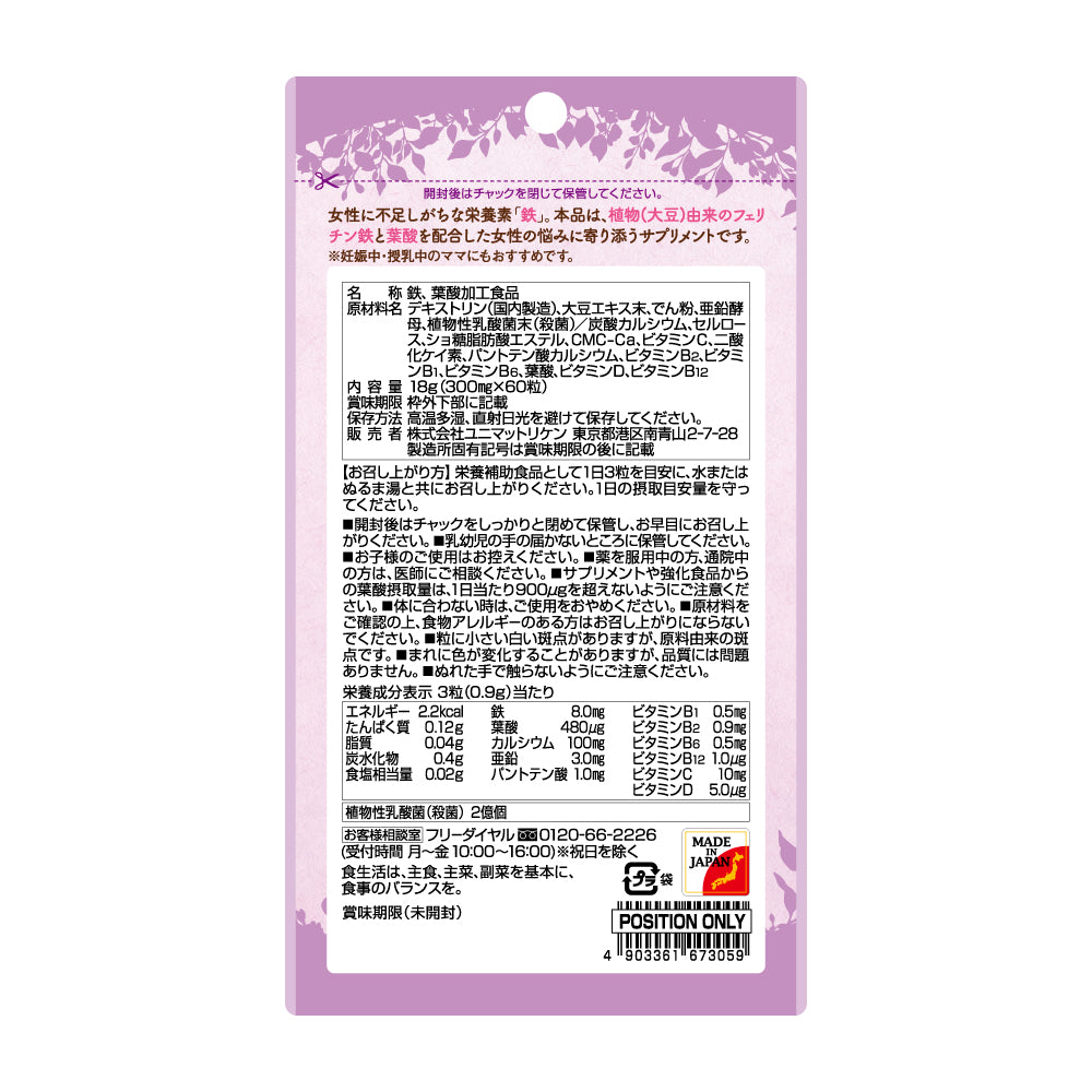 本品は、植物(大豆)由来のフェリチン鉄に、さらに、葉酸を含む8種のビタミン、亜鉛、カルシウム、お米由来の乳酸菌をプラスしました。